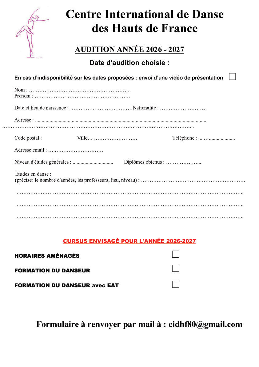 * Pour les candidats aux formations de danse ne pouvant pas se rendre à l'une des dates proposées, vous pouvez nous faire parvenir une vidéo de présentation